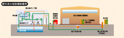 屋外にある 消火栓から放水し火災を消火する仕組みとなっています。
